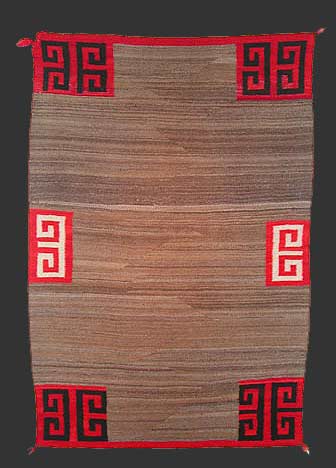 | | A Double Saddle Blanket with a Grey Field and Six Red Boxes, Navajo, circa 1890 - 1900. The blanket measures 35 inches wide by 51 inches long, as woven. Condition is excellent with less than 3% restoration. Colors are original and full. The reds are handspun dyed with synthetic dyes; the brown and the whites are undyed handspun; the greys are undyed brown and undyed white fleeces carded and spun together to create grey. |