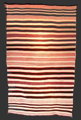 | | A Late Classic Striped Serape with a White Field and Stripes of Manchester Bayeta, Navajo, circa 1865 - 1870. The serape measures 48 inches wide by 80 inches long, as woven. Condition is excellent with less than 1% restoration. Colors are original and full. The reds are raveled bayeta dyed with cochineal; the browns and the whites are undyed handspun. The presence of a two-ply wool warp suggests that this serape was woven by a Navajo women living in a Spanish household. |